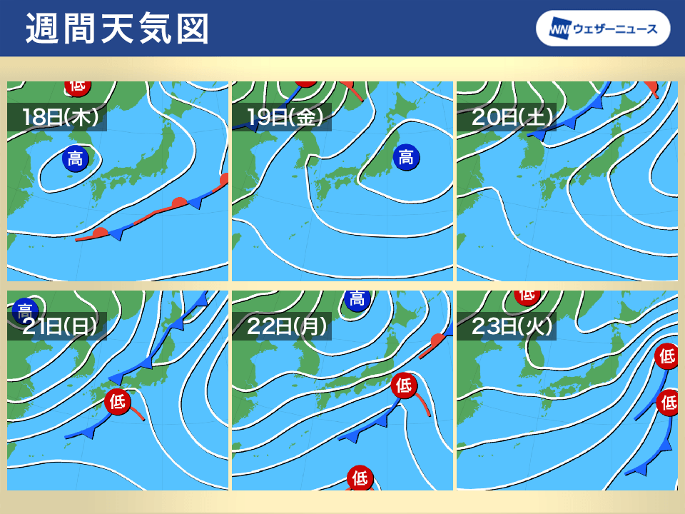高気圧が東に遠ざかる20日(土)から、天気は下り坂に向かいます。