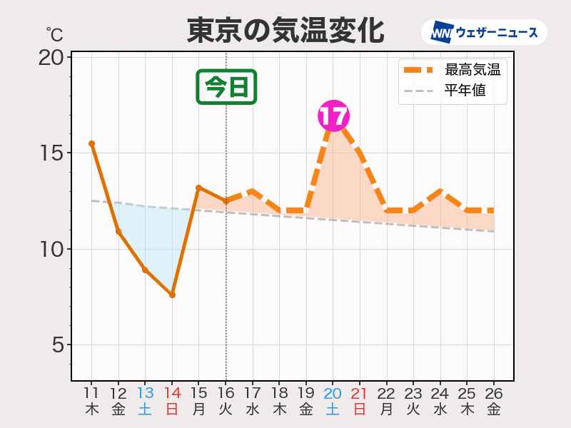 特に週末にかけて、東日本や西日本では最高気温が15℃以上となるところがほとんどで、一部では4月並みの気温となるところもある見込みです。