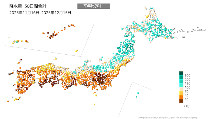 西日本・東日本太平洋側では先週末の13日(土)から14日(日)にかけて広く雨が降りましたが、過去1か月の降水量は平年比で非常に少ない状態が続いています。