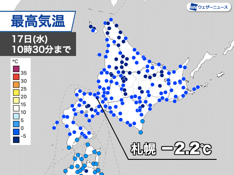 北海道は、上空1500m付近で−12℃以下の寒気に覆われていて、道北や道央にはさらに強い−15℃以下の寒気が流れ込んでいます。