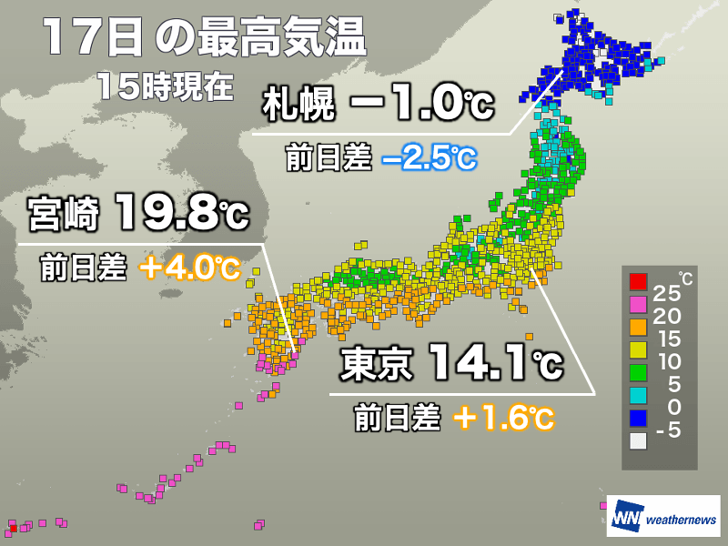 東京都心は、13時07分に最高気温14.1℃を観測。昨日より1.6℃高くなりました。ウェザーニュースアプリに寄せられた体感の投稿も、昨日より「過ごしやすい」や「暖かい」が少し増えました。