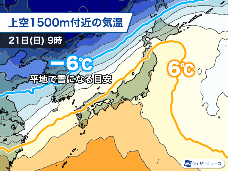 上空1500m付近の気温の予想を見ると、20日(土)には、降水があれば平地でも雪になる目安の−6℃のラインがサハリン付近まで北上します。また、21日(日)には+6℃のラインが北海道の南岸まで北上する見通しです。