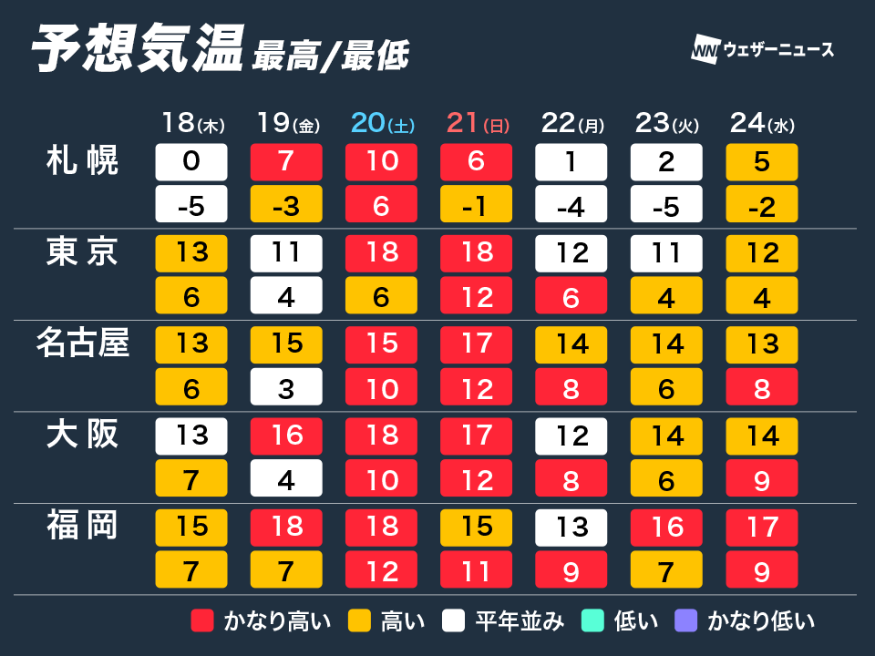 各地の予想気温は、週末をピークに平年よりかなり高くなっています。東京都心の最高気温は20日(土)・21日(日)ともに18℃と、11月上旬並みの見込みです。最低気温も高く、21日(日)には11月23日以来、約1か月ぶりに10℃を上回る可能性があります。