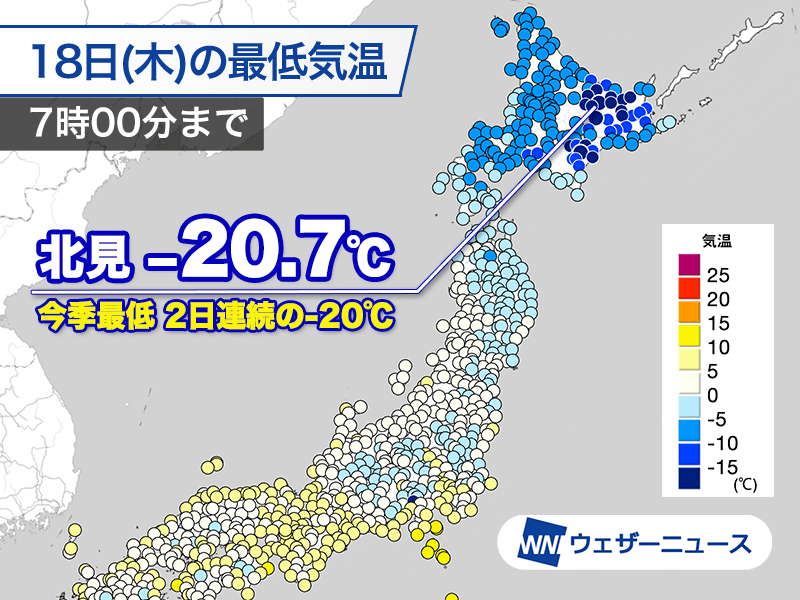 北海道で強い冷え込み 帯広や北見で今季最低気温を更新 北見は2日連続の-20℃