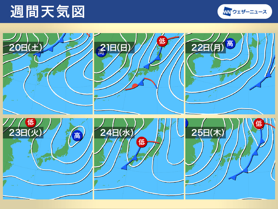 21日(日)の前線通過後は一旦気温が下がりますが、強い寒気の流れ込みは予想されず、再び来週後半に向けて気温が平年より高めになっていく予想です。
