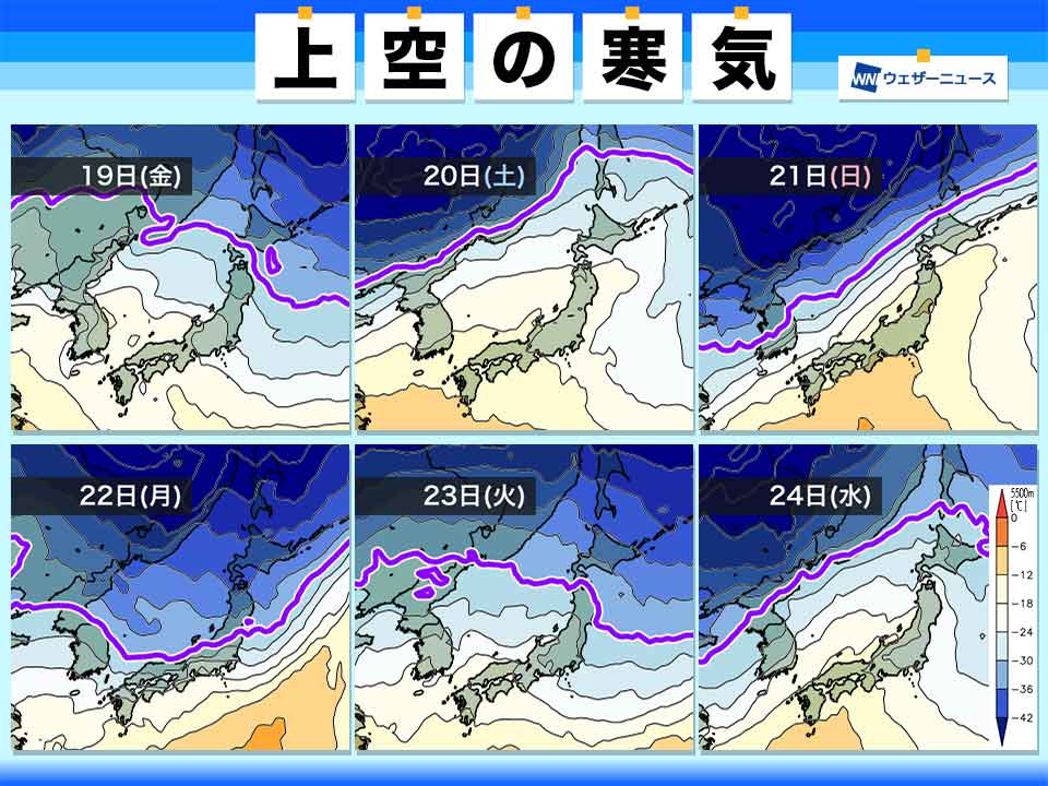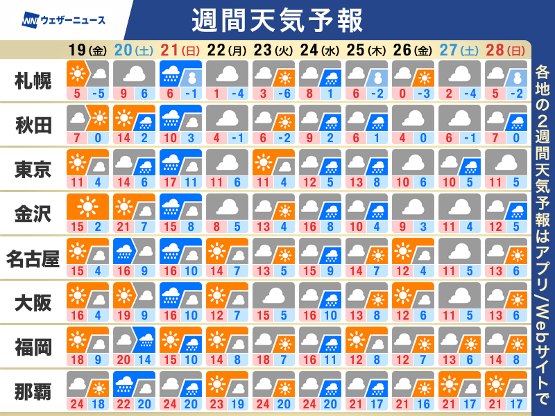 南からの暖気が流れ込みやすい気圧配置になることで、明日19日(金)以降は気温が上昇傾向です。天気が崩れるため暖かいとはいえないものの、雨でも寒さは控えめとなりそうです。