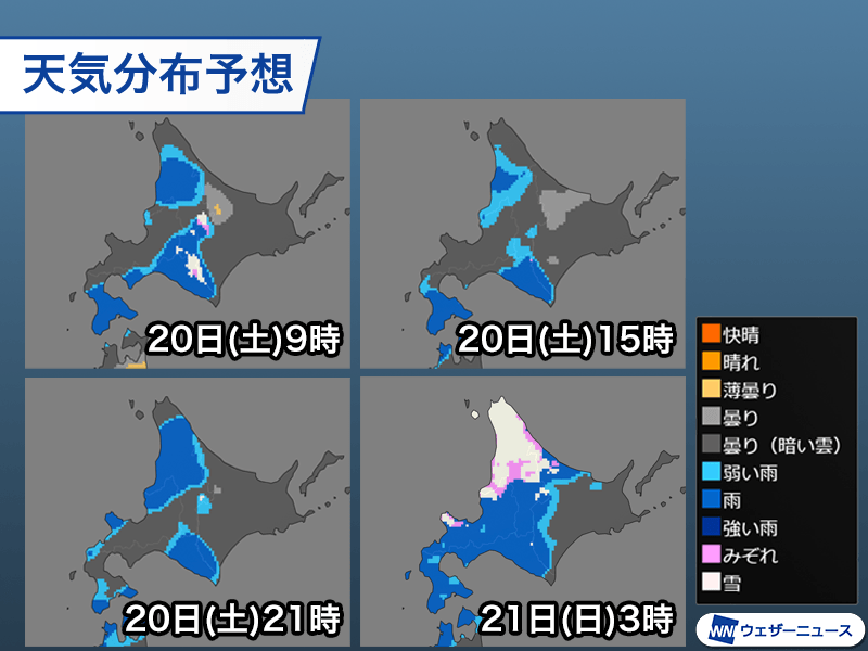 20日(土)の日中は道南の太平洋側や留萌、上川地方などで雨が降る見込みです。道北の内陸部では先週末以降、積雪の増加している所が多いため、そこに雨が降ることで屋根からの落雪や雪崩、冠水などの融雪の影響に注意をしてください。