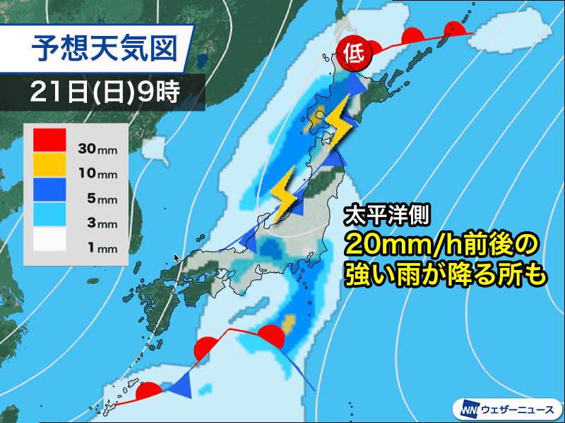21日(日)は太平洋側でも低気圧が発生し、日本海の前線とともに日本列島を通過していきます。