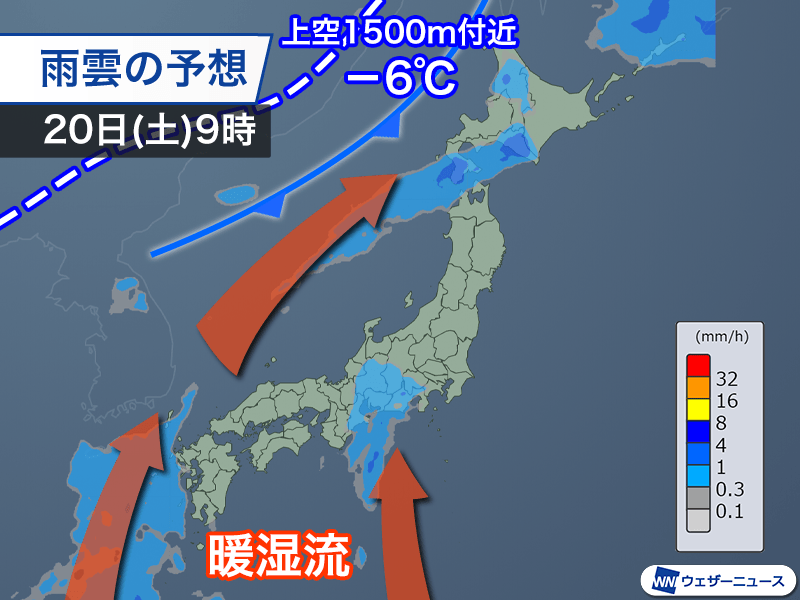 平地で雪を降らせる目安の上空1500m付近で−6℃以下の寒気は、20日(土)朝の時点で北海道のさらに北まで後退するため、雪になるのは北海道の山間部に限られます。