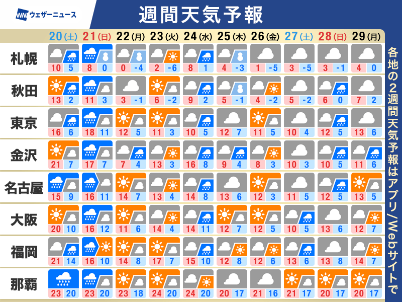 21日(日)の前線通過後は一旦気温が下がりますが、強い寒気の流れ込みは予想されず、再び来週後半に向けて気温が平年より高めになっていく予想です。
