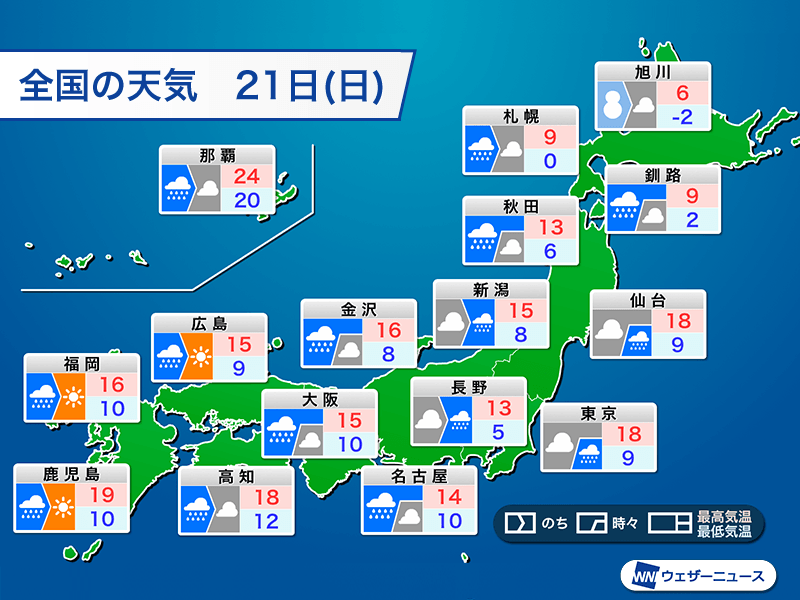 明日21日(日)は前線の通過前と通過後で気温が大きく変化します。