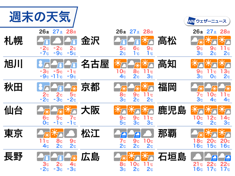 冬型が弱まりはじめる27日(土)も寒さは続き、東京都心の最高気温は8℃、札幌市は−2℃と連日の真冬日の予想です。