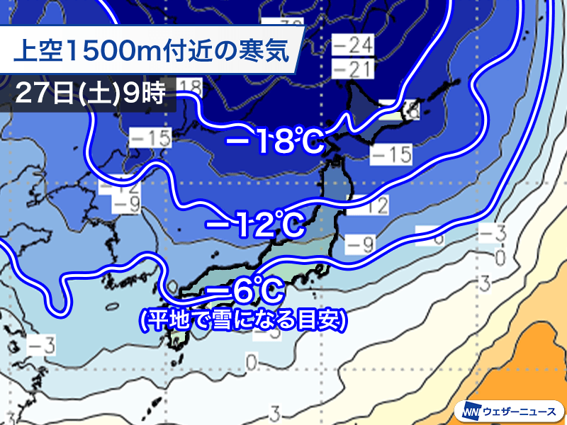 寒気のピークとなる27日(土)の朝には、平地で雪を降らせる目安の上空1500m付近−6℃以下の寒気が関東や九州北部に南下し、さらに強い−12℃以下の寒気が北海道から東北北部を覆う見込みです。