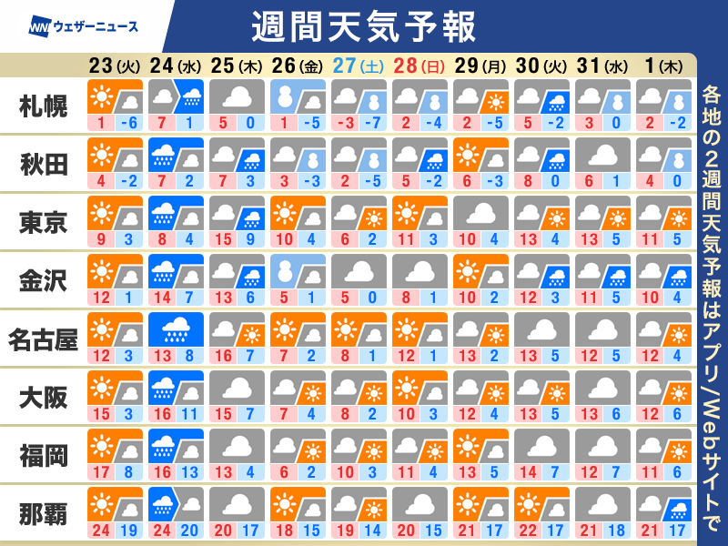 平地で雪を降らせる目安の上空1500m付近−6℃以下の寒気が関東や九州にまで南下し、さらに強い−12℃以下の寒気が東北北部まで覆う見込みです。北海道では27日(土)にかけて−18℃前後の真冬の非常に強い寒気が予想されています。