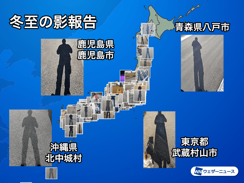 二十四節気の「冬至」は北半球では夜が最も長く、昼が最も短くなる日です。太陽の南中高度が1年で最も低いため、南中時刻の影の長さが最も長くなります。影が一番短い「夏至」に比べると45度以上も低い南中高度です。