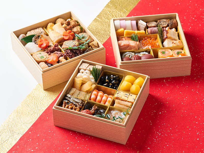それぞれの重箱への詰め方には“しきたり”があり、現在主流の三段重では、祝い肴と口取りは一の重、焼き物や酢の物は二の重、煮しめは三の重とされています。