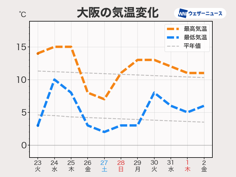 この先は週末にかけて寒暖差が大きくなります。クリスマス頃は上空に暖かい空気が入り込んで気温が上がる一方、週後半は寒気が南下して平年を下回る気温となり、寒さが厳しくなる見通しです。