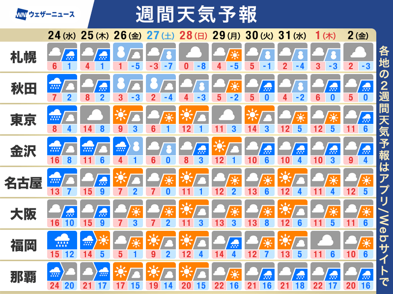 太平洋側は26日(金)以降は日差しの届くところが多くなりますが、関東ではシアーライン(風の流れが変化する境界線)の影響でにわか雨や雪の可能性があります。また29日(月)も湿った空気が流れ込み、東日本太平洋側を中心に雲が広がりやすくなる見込みです。