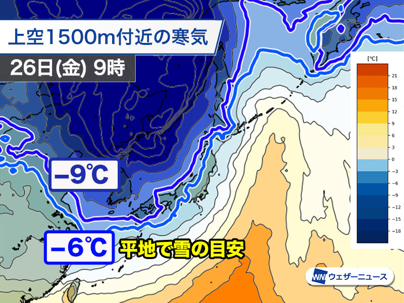 明後日25日(木)から26日(金)にかけて日本の周辺では次第に冬型の気圧配置が強まります。26日(金)朝には平地で雪を降らせる上空約1500mで−6℃以下の寒気が西日本や東海を広く覆い、さらに一段強い−9℃の寒気が山陰や九州北部まで南下する予想です。