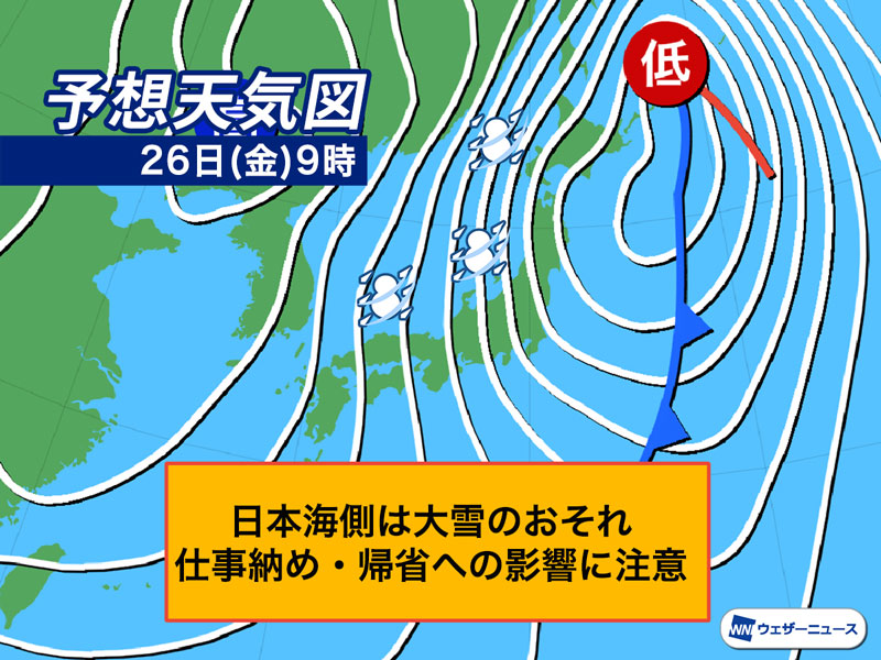 金曜日は日本海側で大雪のおそれ 仕事納め・帰省ラッシュへの影響に注意