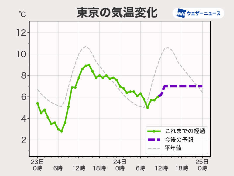 12時現在、東京の最高気温は未明の0時27分に観測された7℃です。その後気温は低下に転じ、今朝の7時59分には最低気温の4.9℃を観測しました。その後は緩やかな上昇に転じ12時の時点では6.2℃を観測しています。