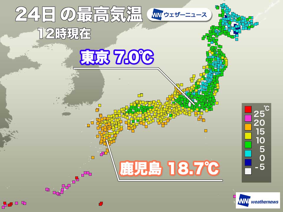 一方、同じく雨が降っていていも気温の上昇が顕著なのが九州で鹿児島では11時33分に18.7℃を観測しました。最高気温としては11月下旬並みです。