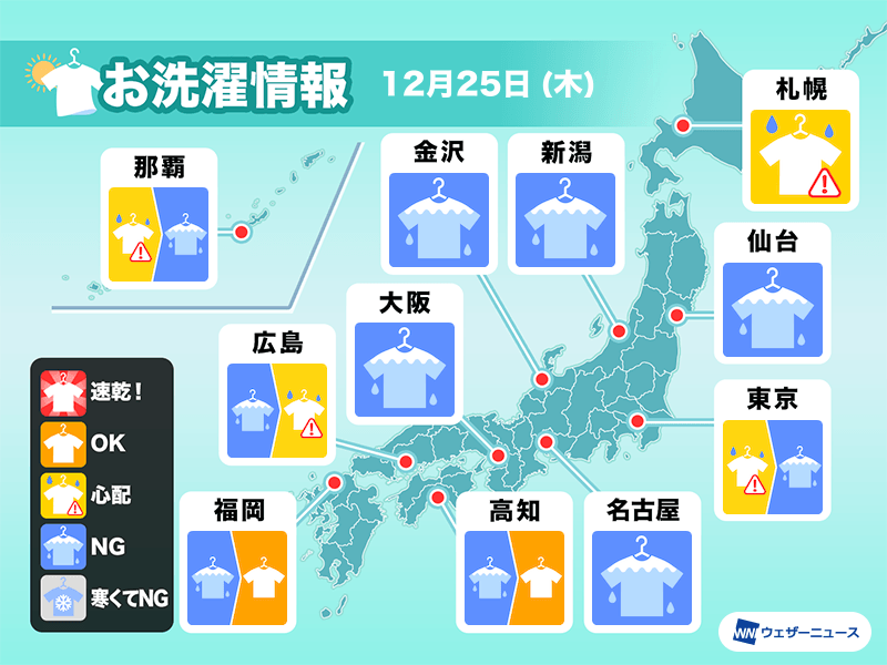 明日にかけて雨や雪の続く地域もあります。洗濯物が溜まっている場合は、コインランドリーや乾燥機の使用をご検討ください。