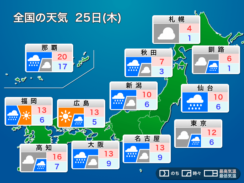 明日25日(木)は徐々に冬型の気圧配置に変わり、日本海に発生した低気圧が能登半島沖に接近。上空の強い寒気が南下して、大気の状態が不安定になります。