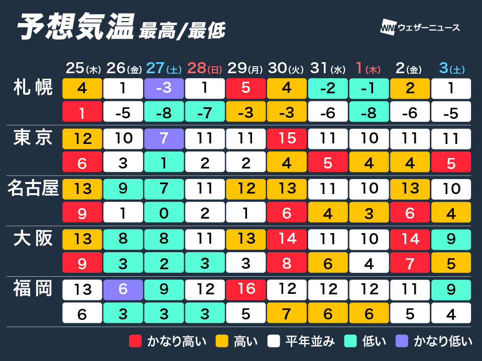 翌日27日(土)も朝の冷え込みが厳しく、予想最低気温は高知や名古屋で0℃、東京で1℃です。寒気の影響が長引く北海道では昼間でも気温が上がらず、札幌は真冬日予想となっています。