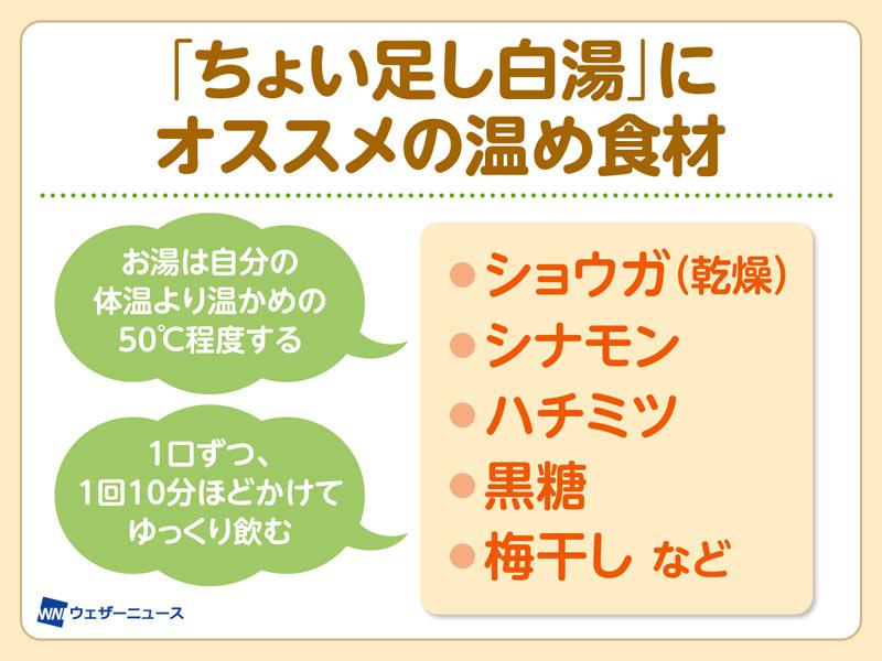 “温め食材”である、ショウガ、シナモン、ハチミツ、黒糖、梅干しを足す、『ちょい足し白湯』もお勧めです。ちょい足し白湯のつくり方は、人肌から50℃程度のお湯を食材に足すだけです」(石原先生)