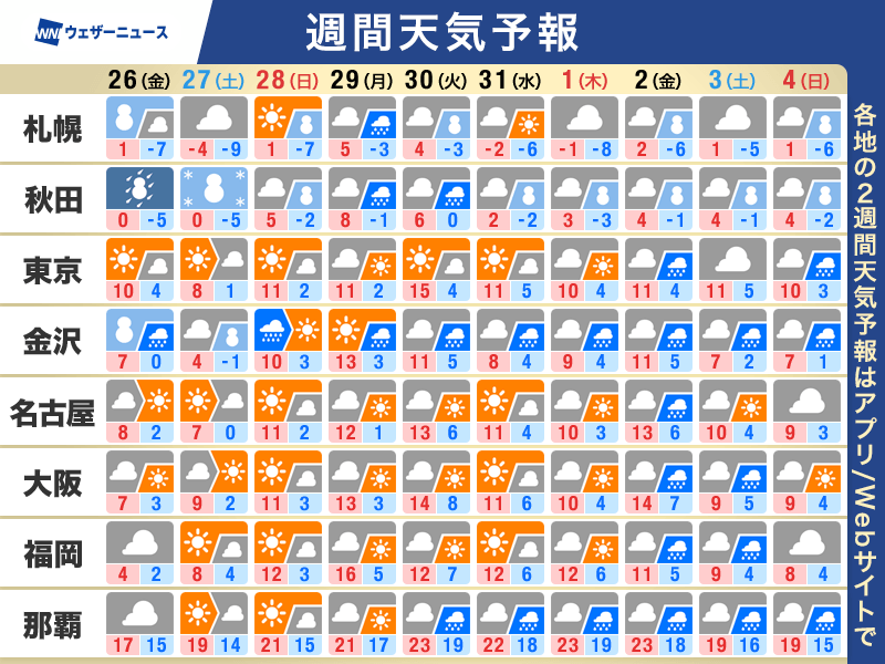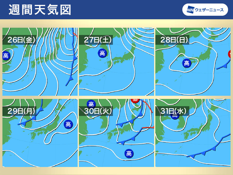 27日(土)も冬型の気圧配置で、日本海側の地域を中心に雪が降ります。28日(日)になると冬型は次第に緩みますが、29日(月)から31日(水)にかけては低気圧や前線の影響で、北日本や北陸などで雪や雨の降るところが多くなりそうです。