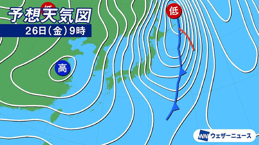 仕事納めの方が多い明日26日(金)は、冬型の気圧配置が強まり日本海側の地域を中心に雪が降ります。東北や北陸を中心に大雪に警戒が必要で、立ち往生などによる車両滞留も懸念されます。