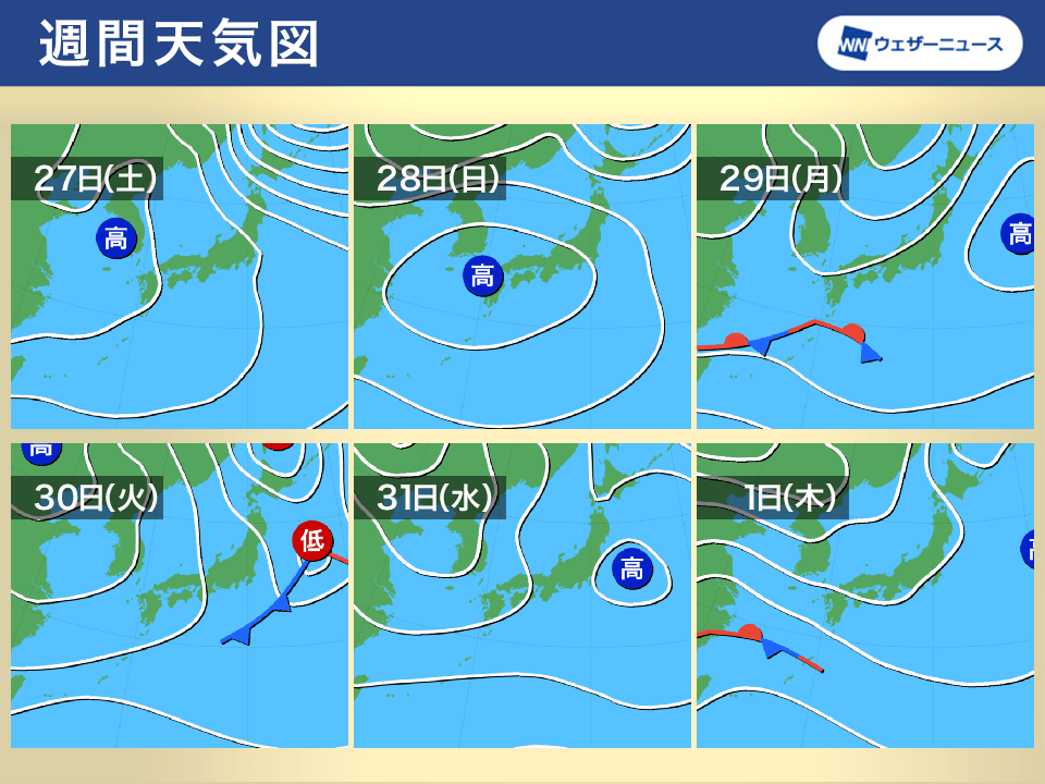 27日(土)も日本海側の地域を中心に雪が降りますが、冬型の気圧配置は西から次第に緩みそうです。太平洋側ほど日差しが届く見込みとなっています。28日(日)は高気圧に広く覆われ、日本海側の雪や雨は次第に弱まってきます。全国的に穏やかな天気となりそうです。29日(月)〜31日(水)は荒れた天気は予想されていませんが、低気圧や前線の影響で日本海側の地域を中心に雪や雨が降り、関東などでも太平洋側も雲優勢となるタイミングがありそうです。