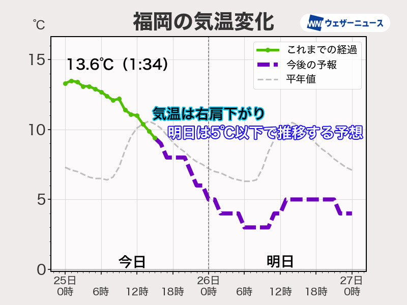 今日25日(木)の九州は気温が右肩下がりです。福岡の最高気温は未明に観測された13.6℃で、日中は少しづつ気温が下がっています。中国や四国も気温は朝からほぼ横ばいで経過しています。