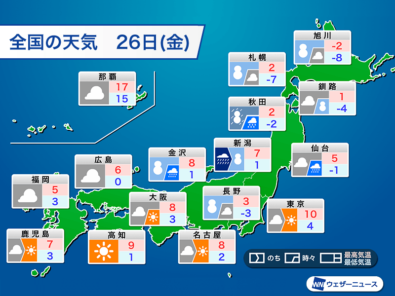 秋田は2℃、札幌は2℃まで上がる見込みです。北日本は雪や風の強まるところが多く気温の数字以上に寒く感じられそうです。