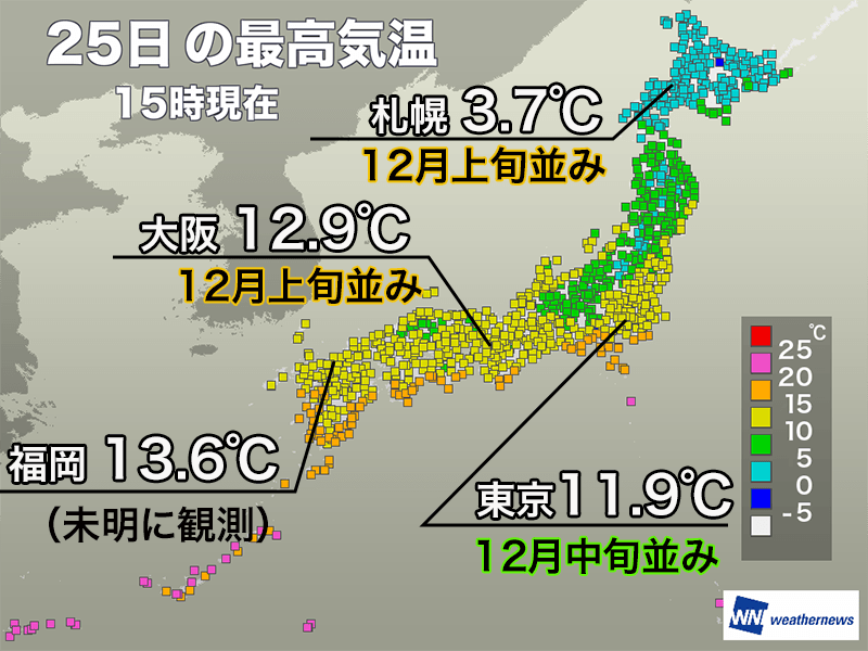 東海や関東は日差しがないため空気の冷たさが残りました。15時までの最高気温は大阪12.9℃、名古屋12.5℃、東京11.9℃でした。