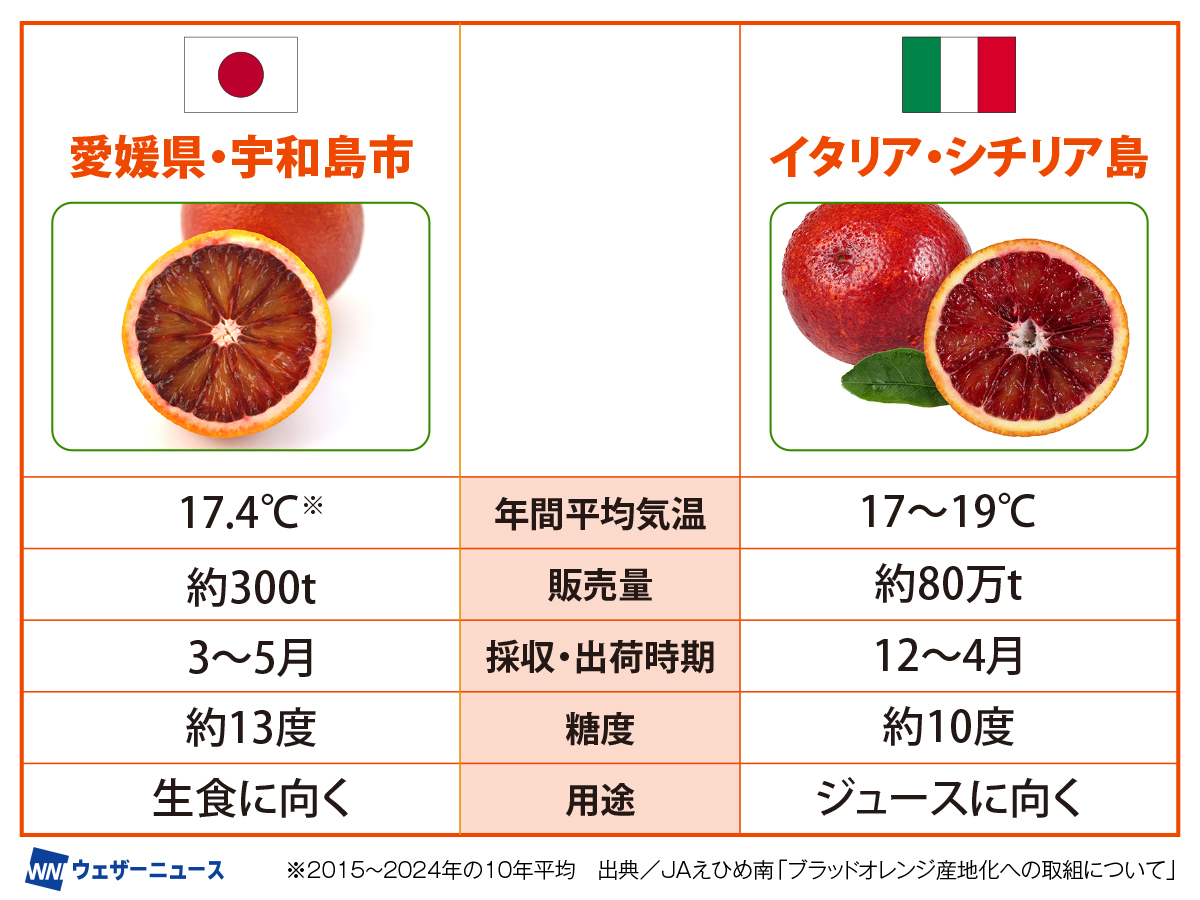 シチリア島のブラッドオレンジも宇和島のブラッドオレンジも、陽射しに恵まれ夏は高温で、冬も温暖な気候を生かして栽培されています。シチリア島のブラッドオレンジは糖度が10度程度で、ジュースなどの飲用に向いています。