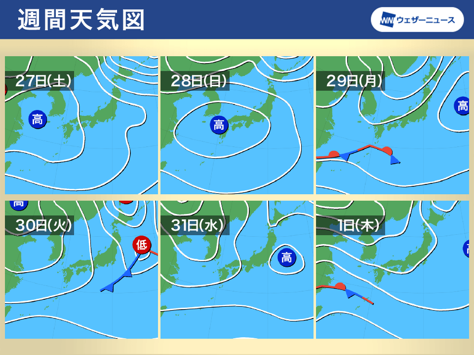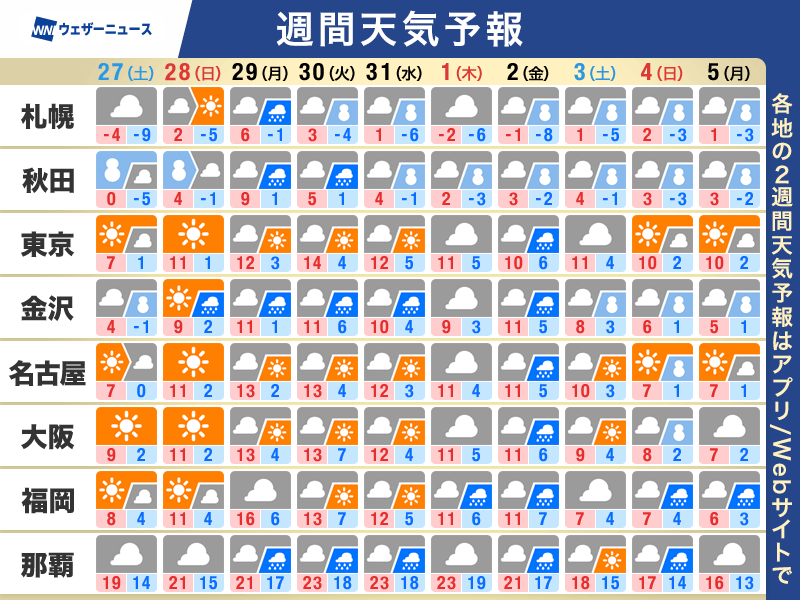寒気の影響で今週末は全国的にこの時期としては気温が低くなります。寒さが緩んでいたところからの落差が大きくなるので体調管理にご注意ください。