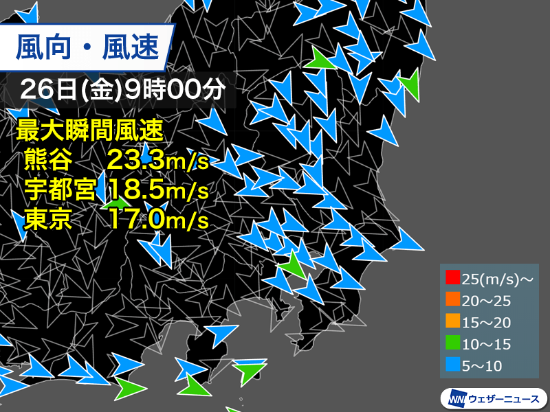 ただ、気温は高くても冷たい風が強く吹いているため体感的にはかなりの寒さです。8時40分までの最大瞬間風速は埼玉県熊谷市で23.3m/s、東京都心で17.0m/sを観測しています。