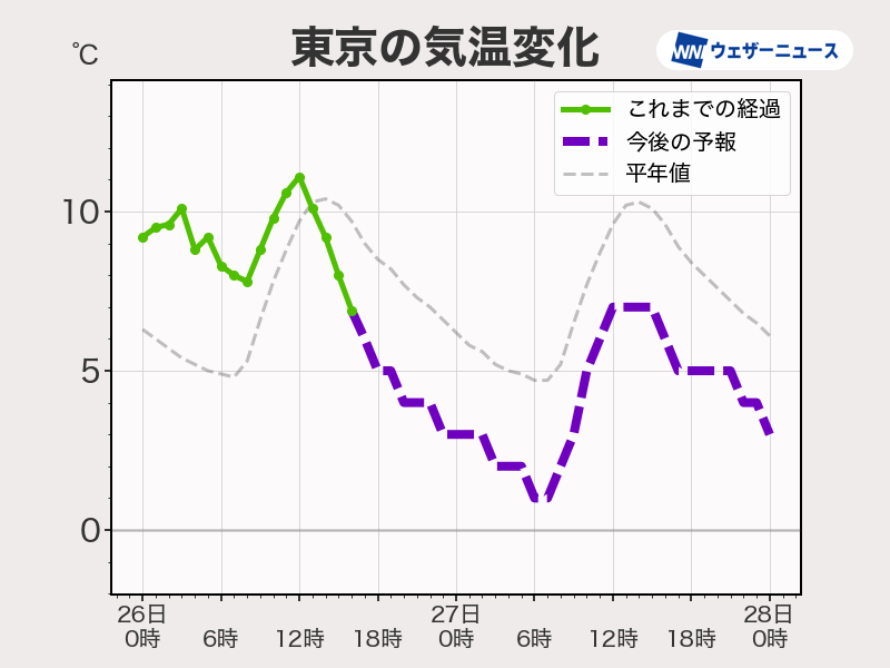 昼間は寒気の影響が段々と小さくなるため、今日よりは高い予想です。それでも10℃に届くかどうかで、冬の寒さは続きます。