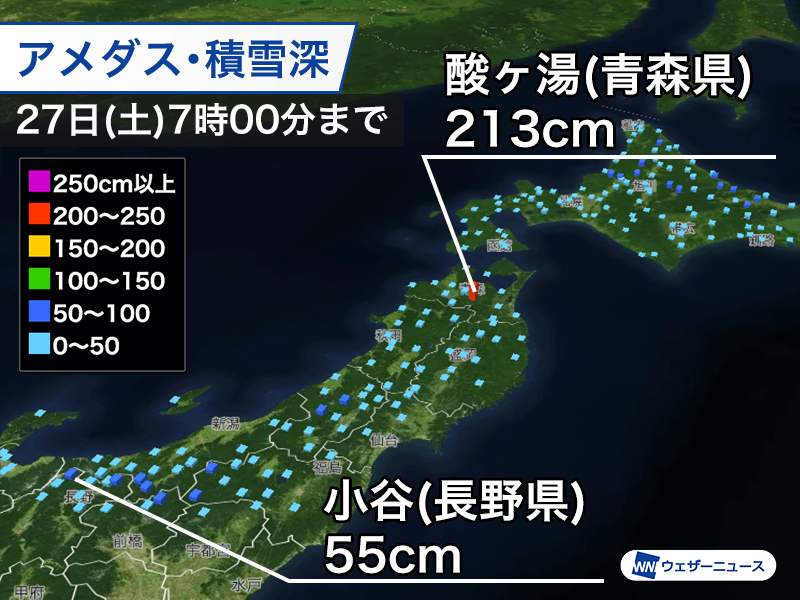 今日27日(土)の7時00分時点での積雪深をみると、北日本や日本海側の各地では50cm以上となっている所が多く、青森県酸ヶ湯では213cmとなっています。