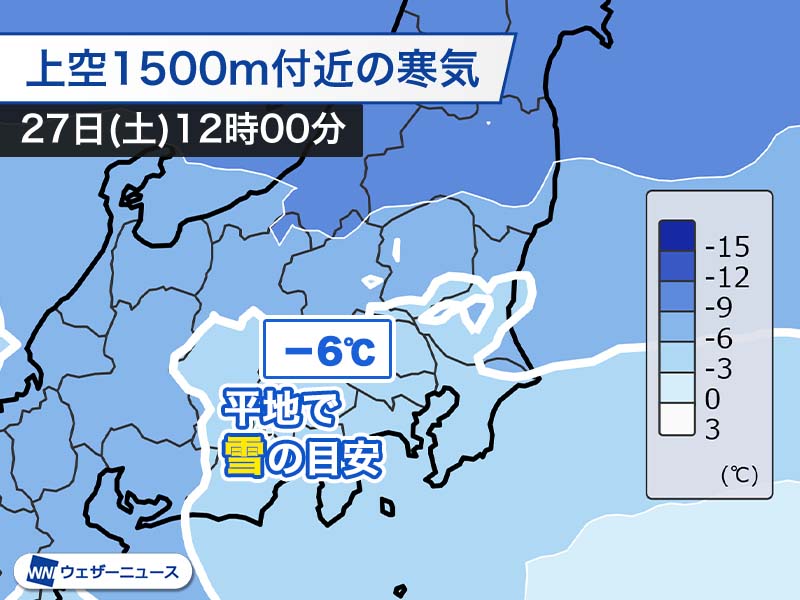 今日27日(土)は、降水があれば平地でも雪になる目安とされる上空約1,500mで−6℃以下の寒気が、関東北部や千葉県北東部の一部を覆っています。また、伊豆半島沖では北寄りの風と西寄りの風が収束し、伊豆半島から関東南部を中心にレーダーに映りにくい低い雲が広がっている状況です。