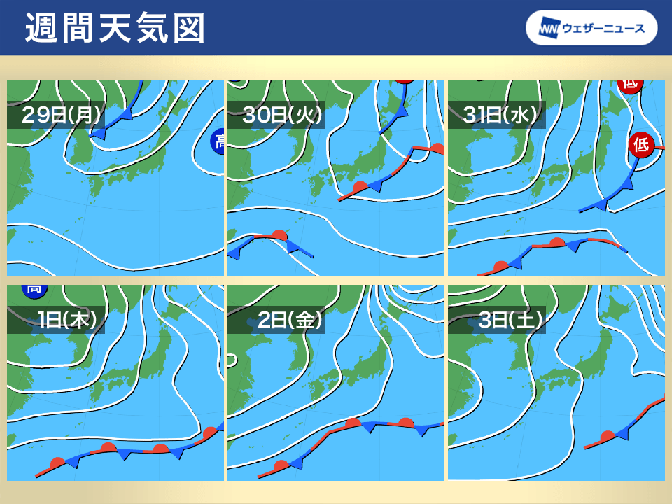 西日本や東日本の太平洋側は晴れる日が多くなります。