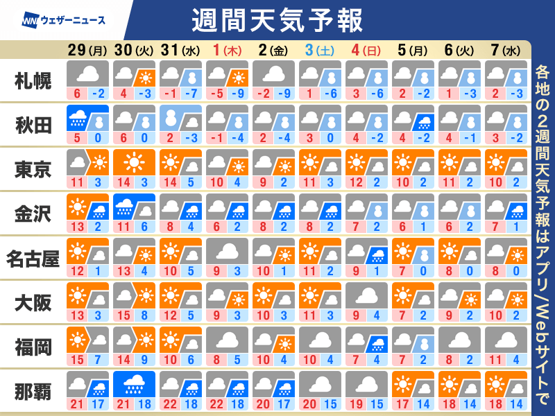 その後、年明けにかけては再び寒さが戻ります。北ほど気温の変化が大きくなるため、年末年始の忙しい時期に体調を崩さないよう、服装を調節するなど、体調管理を心がけてください。