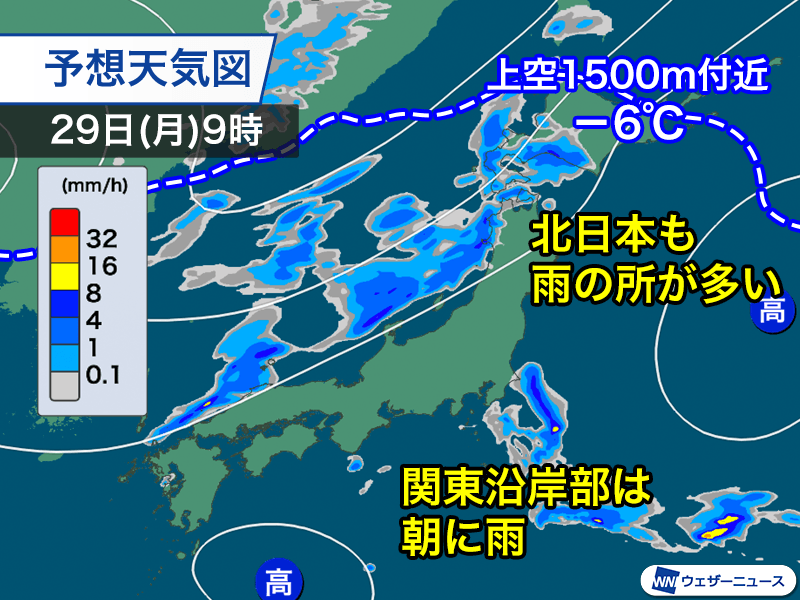 朝は伊豆諸島北部から千葉県の一部で雨が降りやすく、そのほかの関東南部も雲が広がって、一時的に雨のぱらつく可能性があります。