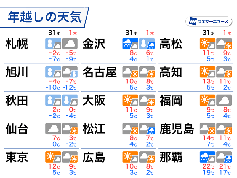 大晦日から元日は北日本で冷え込みが強く、元日の最低気温は札幌市で−9℃、旭川市で−12℃まで下がる予想となっています。秋田市や仙台市も氷点下の冷え込みになる見込みです。