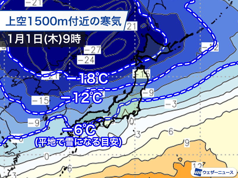 1月1日(木)・元日の朝には上空1500m付近で−18℃以下の非常に強い寒気が北海道の広い範囲を覆い、平地で雪になる目安の−6℃以下の寒気は、関東北部から瀬戸内海付近まで南下する見込みです。