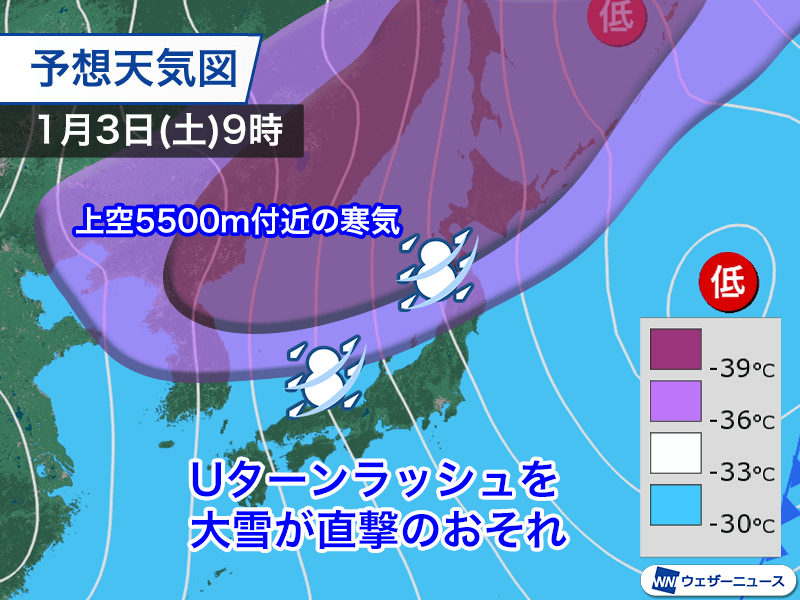年末頃から日本に近づいてくる寒気は、年明けの1月2日(土)から3日(日)頃がピークになるとみられます。上空5500m付近で−39℃以下の寒気の中心が本州付近を通過していくため大気の状態が不安定になり、日本海側の広い範囲で雪雲が発達する見込みです。