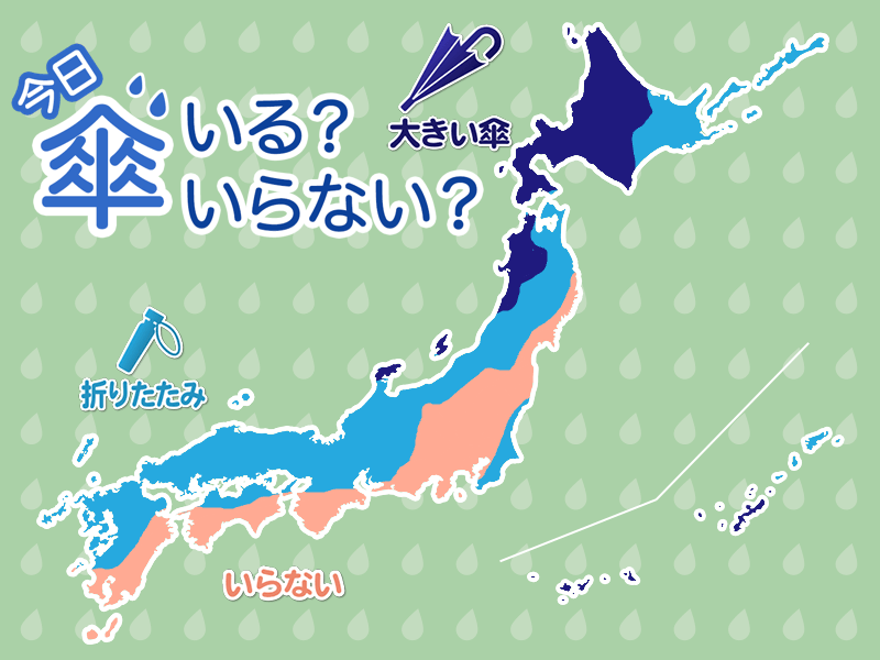北陸から近畿、九州北部も雨の降る可能性があります。特に日本海側は雷やあられを伴うおそれもあるので、お出かけには折りたたみ傘をご用意ください。