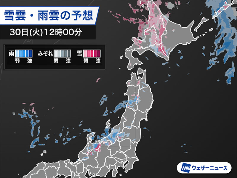 北陸や東北日本海側は、雨や雪が降りやすい天気です。降り方が一時的に強まったり、雷や突風、霰(あられ)などにご注意ください。